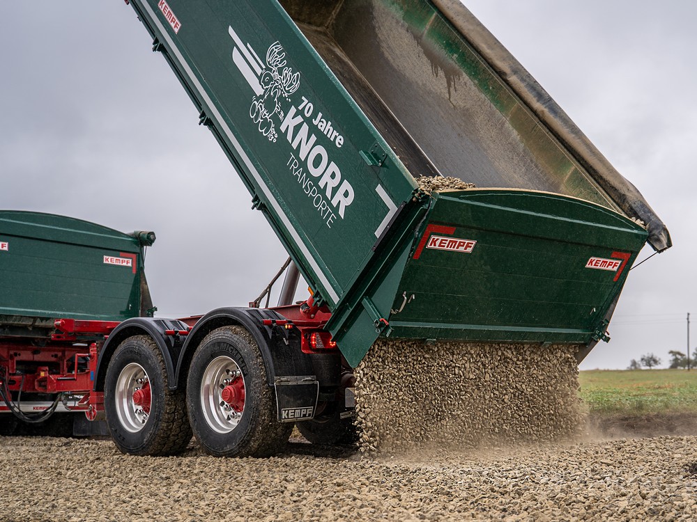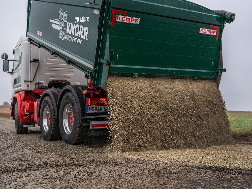 Hier greifen wir gerne auf unser Partnerunternehmen Knorr Transporte zurück, das mit der eigens entwickelten Technik "Easy Splitt 3" und seinen Sattelzügen regelmäßig zum Einsatz kommt. Bei dieser Technik wird mittels der Pendelklappe und dem Neigungswinkel bestimmt, wie viel Schotter abgegeben werden soll. Die drei Dosierklappen geben dann genau vor, auf welcher Spur der Schotter abgegeben wird. Diese lassen sich unabhängig voneinander öffnen.